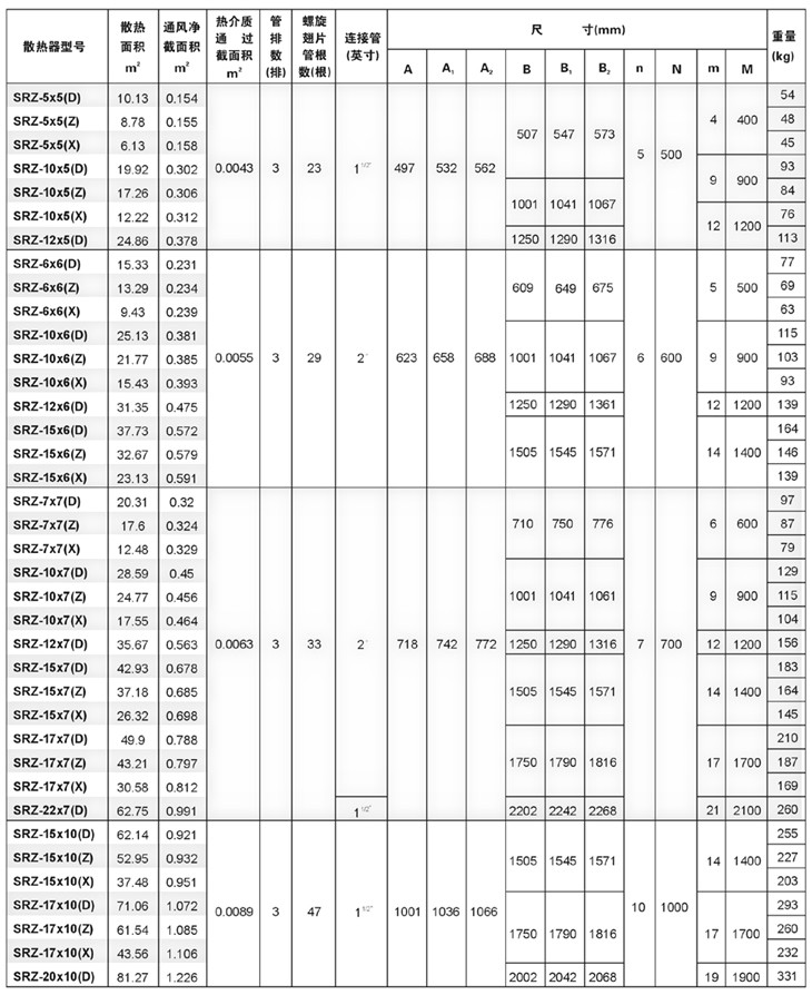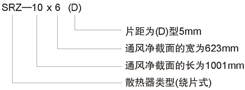 型號—通風(fēng)正截面長度尺寸分米數(shù)的化整×通風(fēng)正截面寬度尺寸分米數(shù)的化整(片距代號)。例如:SRZ15×10(D),則表示內(nèi)凈尺寸長寬約為15分米和10分 米對應(yīng)的通風(fēng)正截面的長度和寬度分別是1505mm和1001mm.片距為5mm,查表可得知散熱器的散熱管只數(shù)位47支,換熱面積為62.14㎡/臺,通風(fēng)凈截面 積為0.921㎡,進(jìn)出口管規(guī)格76mm,外形尺寸1571mm×1066mm.