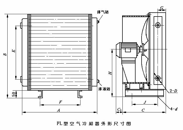FL型空氣冷卻器是液壓系統(tǒng)常用的一種熱交換器。采用環(huán)境空氣作為冷卻源,用來冷卻管內(nèi)熱油,屬于風冷式空氣冷卻器,以“風冷”的第一個字母命名,以換熱面積作為后綴。如FL-5,即表示該型號為風冷形式,換熱面積為5平方米。