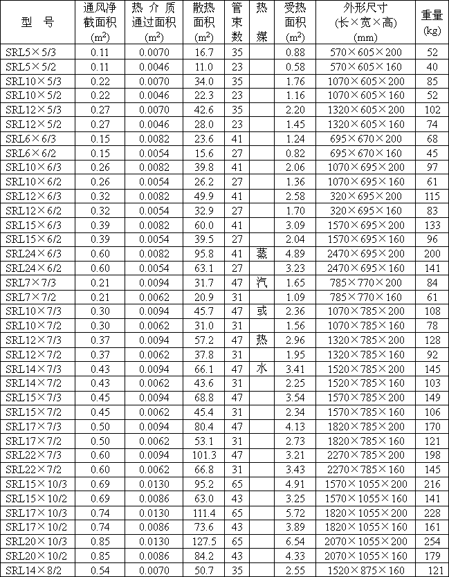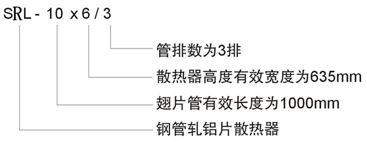 SRL10×7/3即表示該型號(hào)采用鋼鋁復(fù)合翅片管,內(nèi)凈風(fēng)口尺寸為10分米和7分米,三排交叉排列