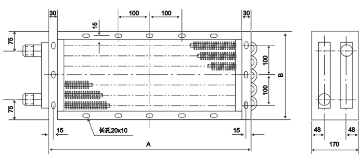 2.GLⅡ型散熱器該換熱器采用φ18x2.0mm無縫鋼管繞上10x0.3mm的鋼帶作為換熱元件,翅片距為3.2mm,呈螺旋狀。進出水管位于同一側(cè),散熱管端面采用U形連接,有效解決了熱脹冷縮產(chǎn)生的應(yīng)力,而且熱媒流程長,有利于換熱。