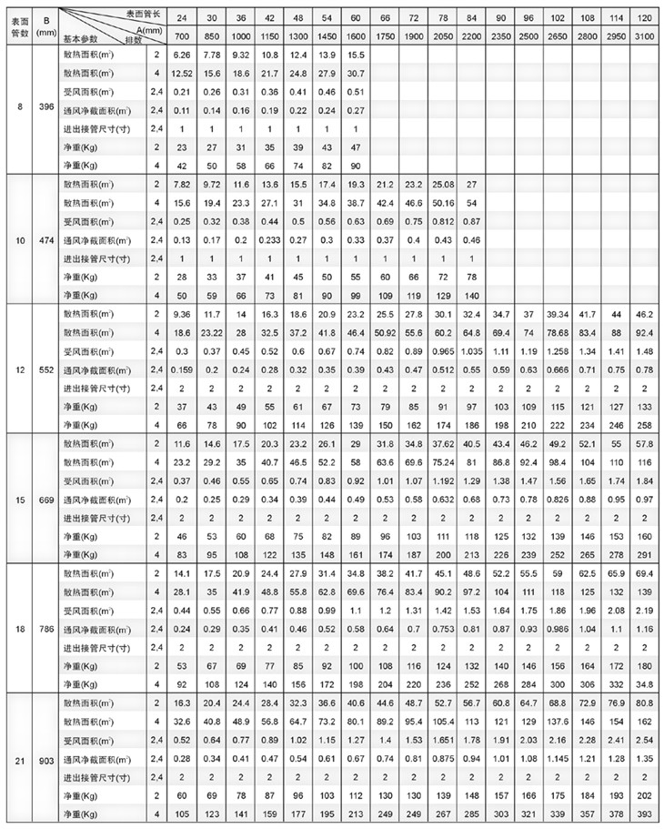 3.GLⅡ型散熱器不同的表面管長、排數(shù)、管數(shù)和不同的翅片片距能組合成多種規(guī)格型號,滿足不同工藝。